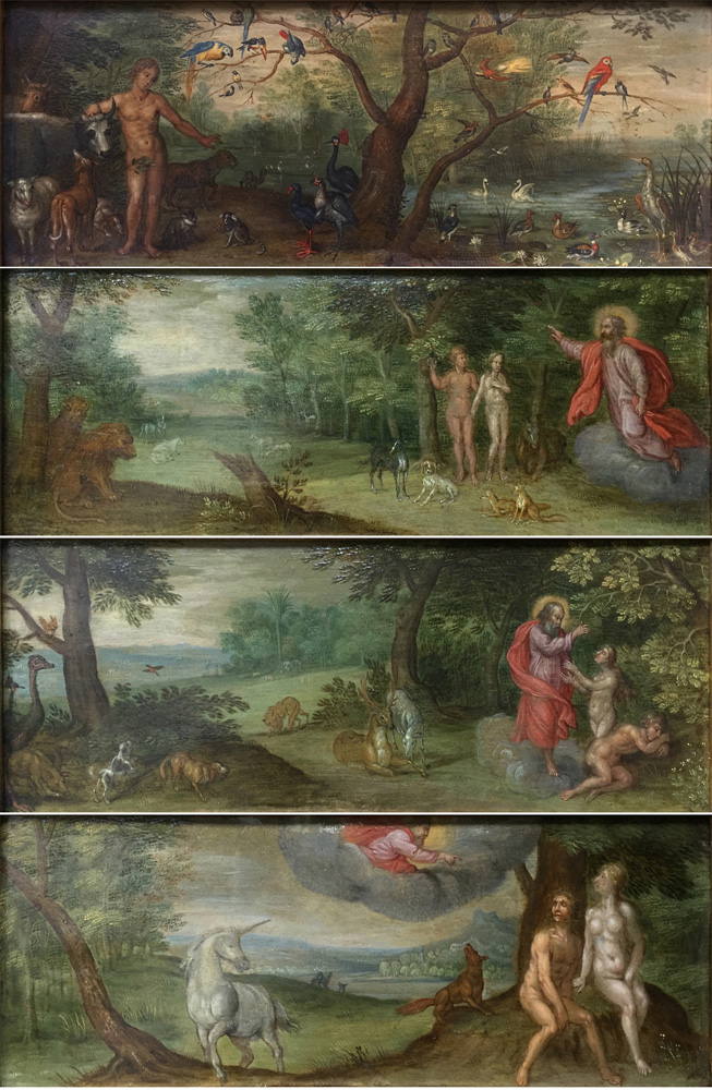 Polyptyque du Paradis terrestre, suite de quatre cuivres flamands fin XVIe-début XVIIe : Adam et les animaux de la Création, Dieu bénit Adam et Eve, Dieu met en garde Eve, Expulsion du Paradis