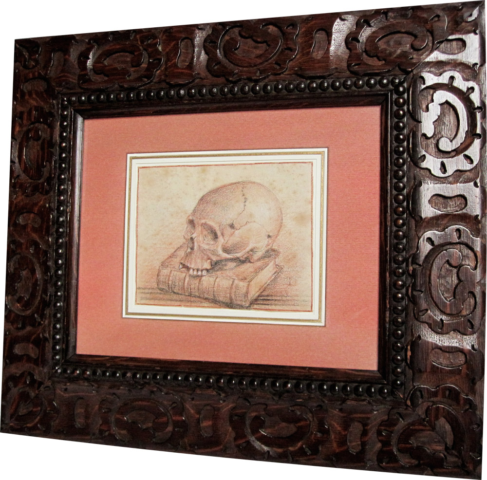 Cette vanité que nous vous présentons ici est d’une exécution parfaite. Les proportions sont harmonieuses, les ombres délicates et l’entablement sur lequel repose le livre soutenant le crâne dessinés à la pierre noire ; tandis que le crâne, jadis siège de la réflexion et conscience d’un homme, semble reprendre vie sous le tracé ferrique de la sanguine.
