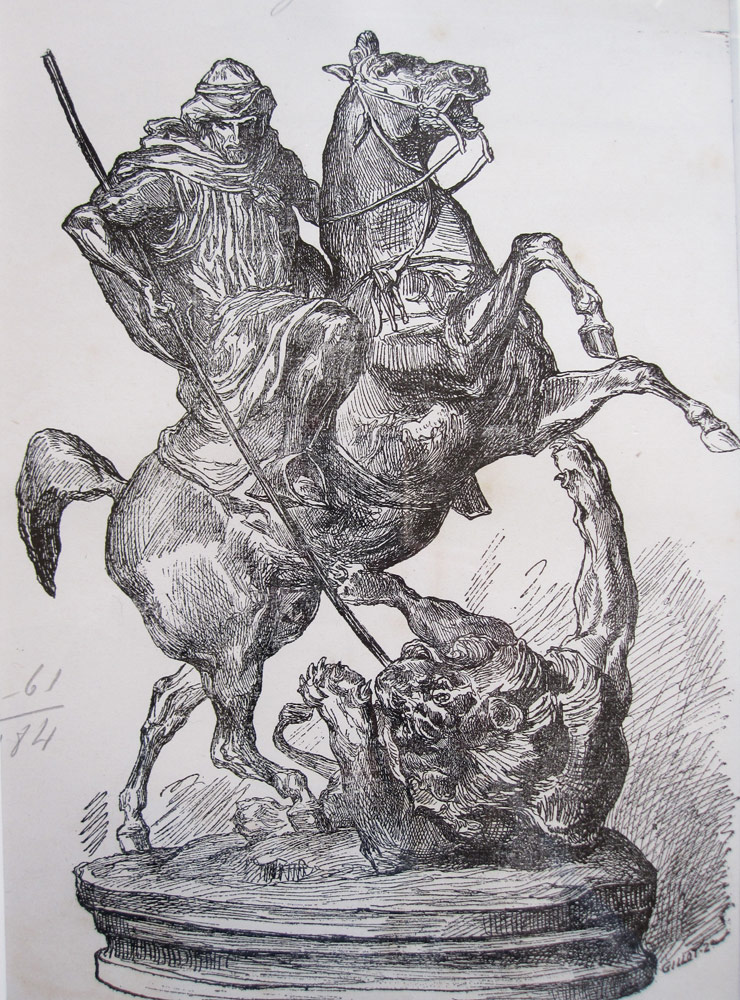 Fidèle à la statuaire en bronze préexistant (Cavalier arabe tuant un lion, modèle non daté, première édition circa 1860, édité pendant quinze ans environ, référence F.15 du catalogue raisonné des sculptures de Barye par Michel Poletti et Alain Richarme), le lion ne gît pas sur la terre brute, toute la scène repose sur un socle circulaire signant peut-être la reddition de la nature face à la civilisation ; trahissant déjà le goût du XIXe siècle pour la domestication de la nature sauvage sans cesser d’être fascinée par elle.