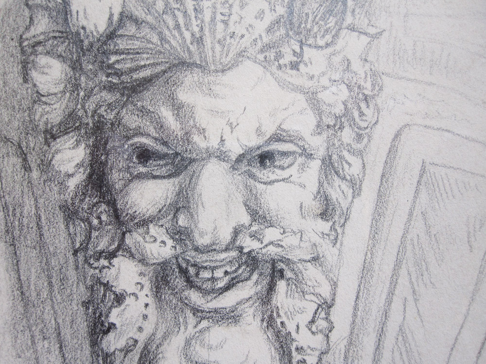 Masque de faune. Dessin encadré sous verre, baguette dorée