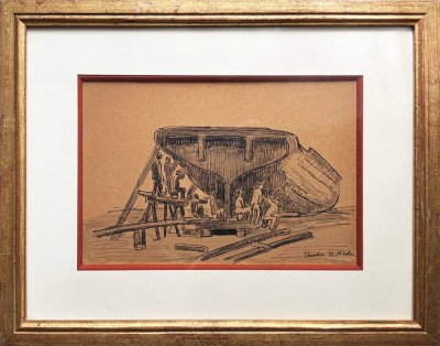 Peské fait dans cette étude l’économie, presque rare dans son oeuvre, de tout rehaut, de l’accentuation par la couleur, probablement pour se concentrer sur le spectacle fascinant du mouvement de ce chantier qui s’offrait à lui ; la grâce de la chorégraphie rigoureuse des huit charpentiers de marine, aux silhouettes soulignées dans des postures toutes différentes, appliqués à réaliser du bel ouvrage.