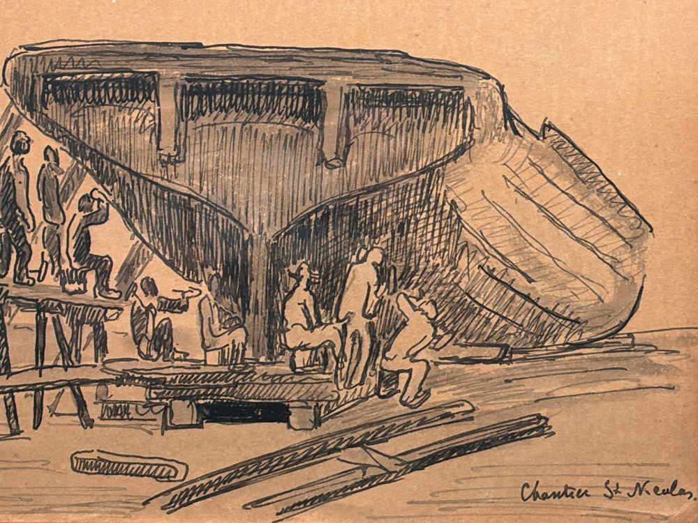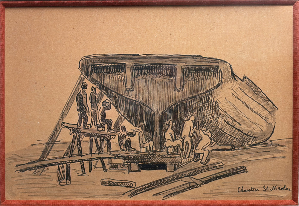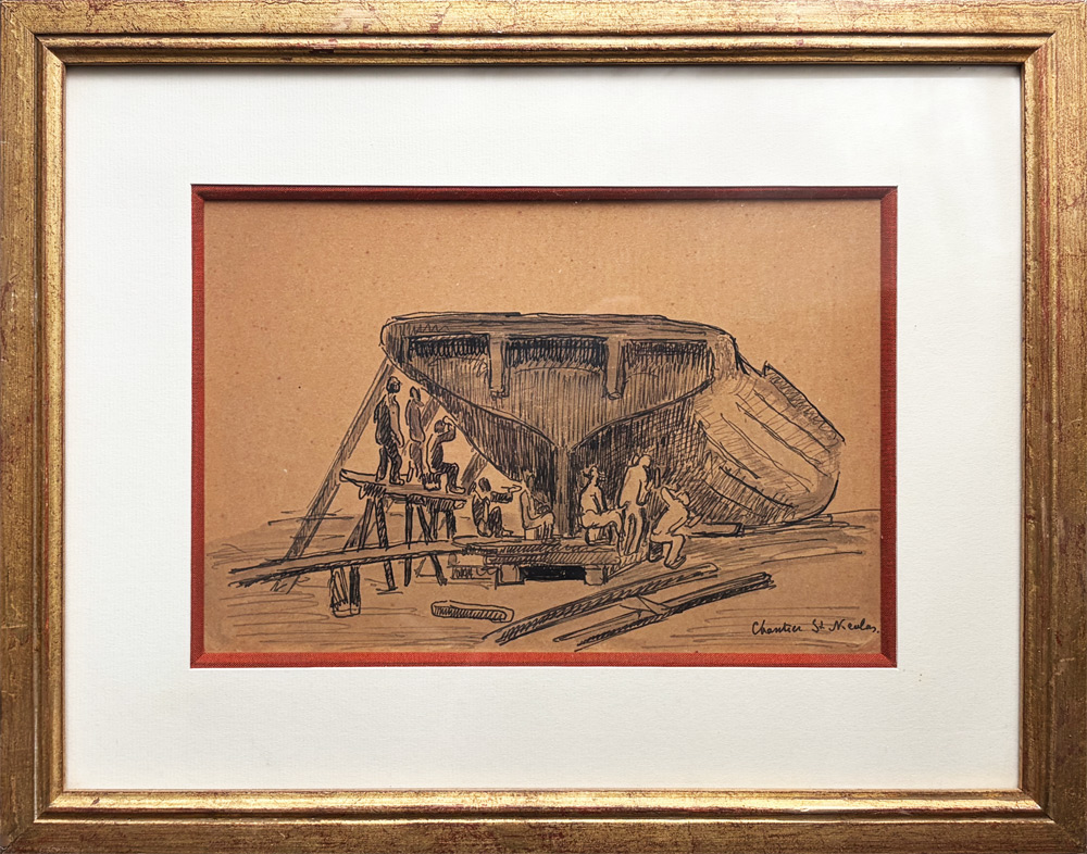 Dessin à la plume et lavis d’encre noire et crayon, situé par l’artiste en bas à droite sur le « chantier Saint Nicolas »24 x 16 cm – encadré : 38 x 30 cm