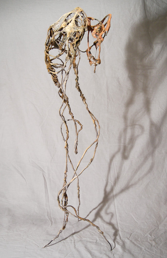 Sculpture de grand format (78cm de hauteur) à l’allure dégingandée, un peu voûtée, comme sous le poids des larmes. Pour arriver à ce spectacle émouvant et visuellement surprenant, il a additionné les forces contemporaines de quatre matériaux : le fil de fer (visible aux deux extrémités formant le piétement), le plâtre, le plastique et le vernis.